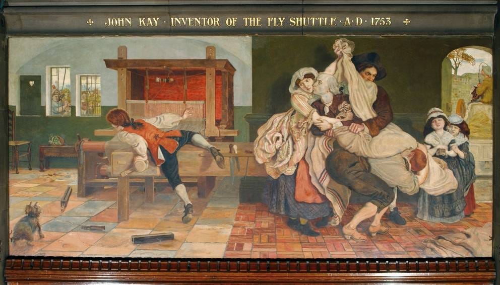 The traditional version of the Industrial Revolution begins with John Kay’s flying shuttle, patented in 1733, which, according to William Radcliffe in 1828, sped up weaving so much that each weaver needed as much yarn (his raw material) as 5-8 people could spin. That was more than his family could provide.3 The flying shuttle thereby threatened a domestic system of production in which all members of a household had contributed to making a finished cloth piece from beginning to end. In this story, improvements in weaving created a bottleneck in household production. To meet the looms’ demand, James Hargreaves invented a spinning jenny and Richard Arkwright devised a water-frame (both patented in 1769), and then came Samuel Crompton’s spinning mule (about 1779) which combined the two. Each device successively improved the quantity and quality of yarn spun to meet the demand of the weavers equipped with the new shuttles that flew.4 Arkwright is also often credited with the invention of the factory (the reason he was knighted), while James Watt invented a steam engine at about the same time, that powered the machines of mass production. Even in the mythological version, people resisted their shift to working for wages in factories, instead of minding their families as workers at home: Luddites broke textile machinery to preserve traditional ways, and further mechanization helped replace them.5