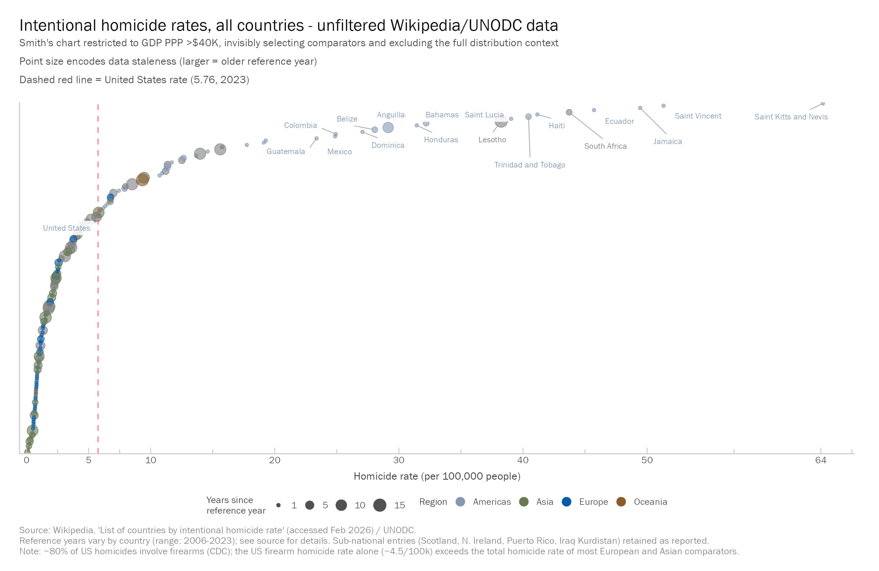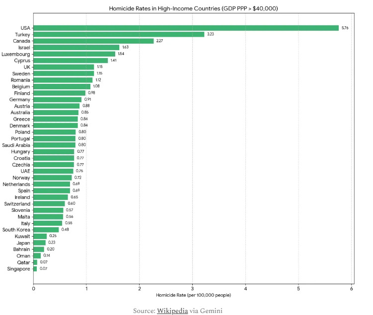 Smith’s causal argument rests on a foundation he declines to examine. His empirical argument rests on something worse. In an homage that would make Reinhart and Rogoff blush (if they ever did), Smith, leveraging the capabilities of Gemini, produces a plot on homicide rates across “comparative” countries to the United States. The “astonishingly huge difference” between the United States and the rest of its “comparative” countries is its high homicide rate. Reinhart and Rogoff, it will be recalled, produced a spreadsheet error that provided the empirical foundation for a decade of European austerity policy. Their mistake was at least their own.