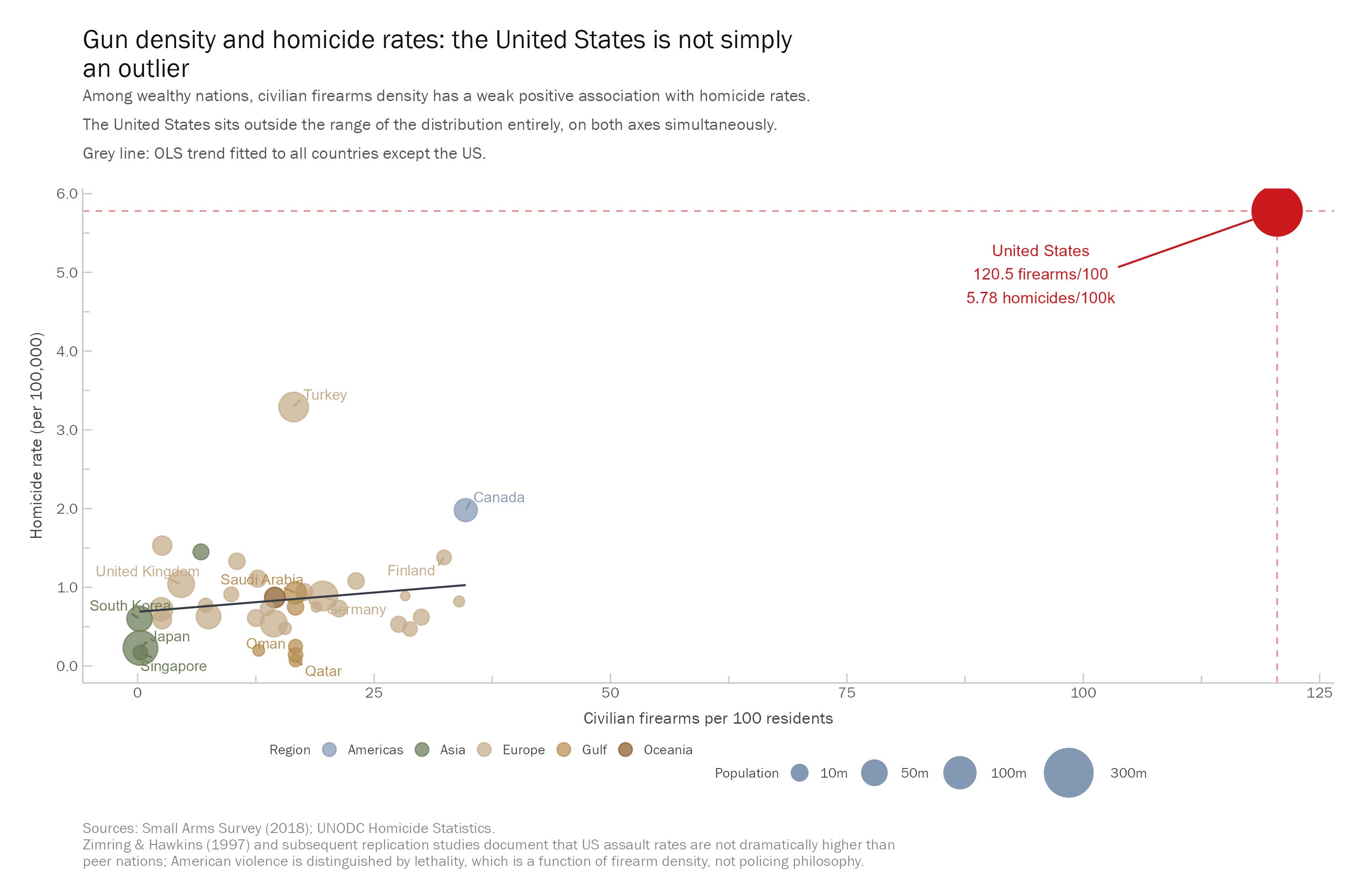 The chart below makes the point more simply than Smith’s preferred methodology allows him to see. It plots civilian firearms per 100 residents against homicide rates across the same nations wealthy enough to appear in his comparison pool, with dot size proportional to population. The grey line is an ordinary least squares trend fitted to every country except the United States. Among peer liberal democracies, the relationship between gun density and homicide is weakly positive and the entire cluster sits below two homicides per 100,000 regardless of where countries fall on the x-axis. The actual American problem falls at the far right edge of the chart, approximately 85 firearms per 100 residents removed from the nearest peer nation, connected to the rest of the plot by a dashed red line because there was no other way to fit it in the same frame.