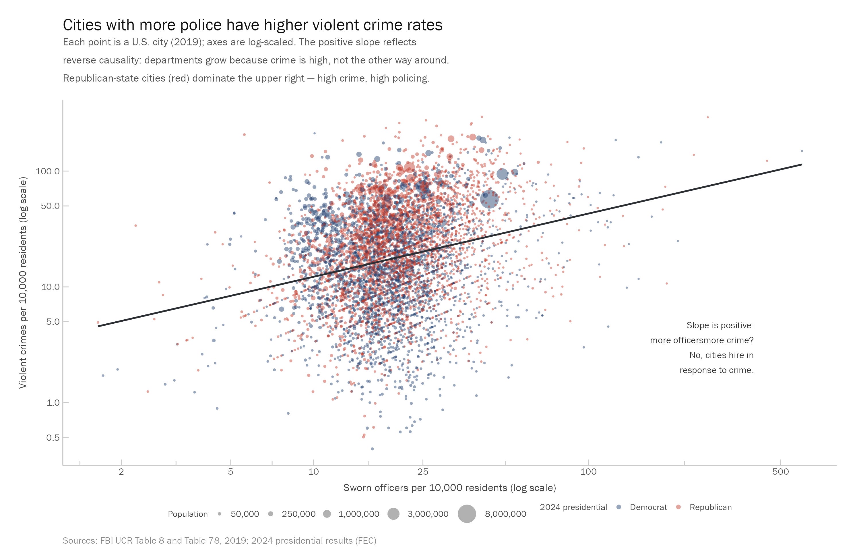 The chart below illustrates the identification problem that Chalfin and McCrary built their entire methodological apparatus to address, and that Smith’s summary of their work quietly drops. The data are drawn from the FBI’s Uniform Crime Reports for 2019 (Table 10 and 78 respectively), plotting sworn officers per 10,000 residents against violent crimes per 10,000 residents for every American city in the dataset, log-scaled on both axes, colored by whether the city sits in a state that voted Republican or Democrat in 2024. Each point is an American city in 2019; the axes are log-scaled; the slope is positive. Cities with more sworn officers per resident have higher violent crime rates. Smith, presumably, would not conclude from this that police cause crime. The slope is positive because the causal arrow runs in the direction any sentient observer would expect: departments grow because crime is high, not the other way around. This is simultaneity bias, and it is the reason a naive cross-sectional regression on police and crime tells you almost nothing about whether hiring more officers reduces violence. It is also, not coincidentally, the reason Chalfin and McCrary’s paper exists.